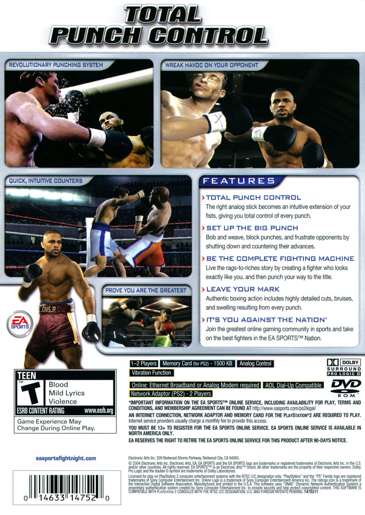 EA Sports returns to the boxing ring with Fight Night 2004. Built to deliver all the drama and pageantry of a heavyweight title bout, Fight Night 2004 features real fighters with authentic moves. With Total Punch Control, the analog sticks become intuitive extensions of your fists, giving you more control over punches, blocks, and dodges. Create your own fighter in Career mode, customize your ring entrance, and then work your way from amateur to undisputed champion.