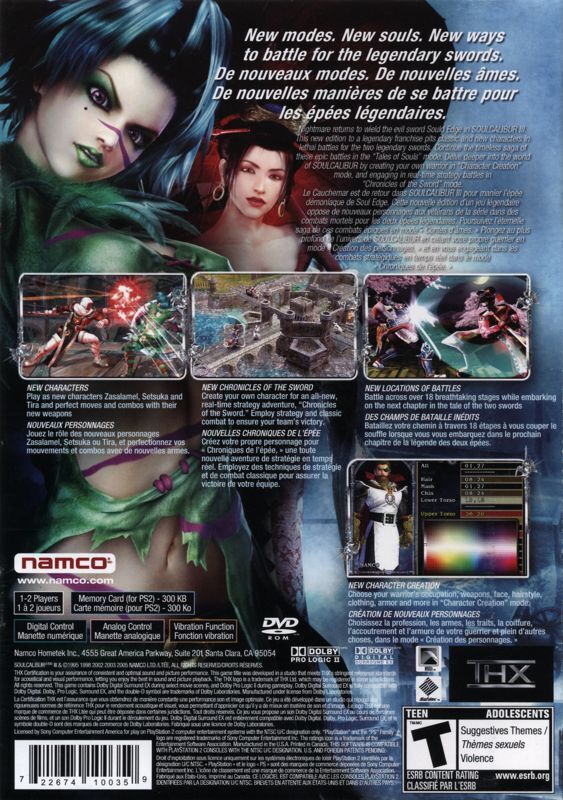 Nightmare returns to wield the evil sword Soul Edge in Soul Calibur III. This new edition to a legendary franchise pits classic and new characters in lethal battles for the two legendary swords. Continue the timeless saga of these epic battles in the "Tales of Souls" mode. Delve deeper into the world of Soul Calibur by creating your own warrior in "Character Creation" mode and engaging in real0time strategy battles in "Chronicles of the Sword" mode.