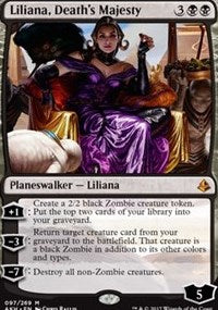 [+1] :黒の2/2のゾンビ・クリーチャー・トークンを1体生成する。あなたのライブラリーの上から2枚のカードをあなたの墓地に置きます。 [-3] :あなたの墓地にあるクリーチャー・カード1枚を対象とし、それを戦場に戻す。そのクリーチャーは、他の色やタイプに加えて黒いゾンビです。 [-7] :ゾンビ以外のクリーチャーをすべて破壊する。 |