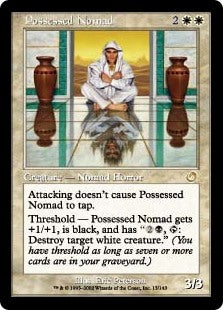 しきい値 — あなたの墓地に 7 枚以上のカードがあるかぎり、憑依された遊牧民は +1/+1 の修整を受け、黒で、「