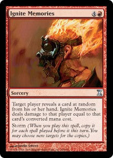 | Card Text: | Target player reveals a card at random from their hand. Ignite Memories deals damage to that player equal to that card's converted mana cost. Storm (When you cast this spell, copy it for each spell cast before it this turn. You may choose new targets for the copies.)