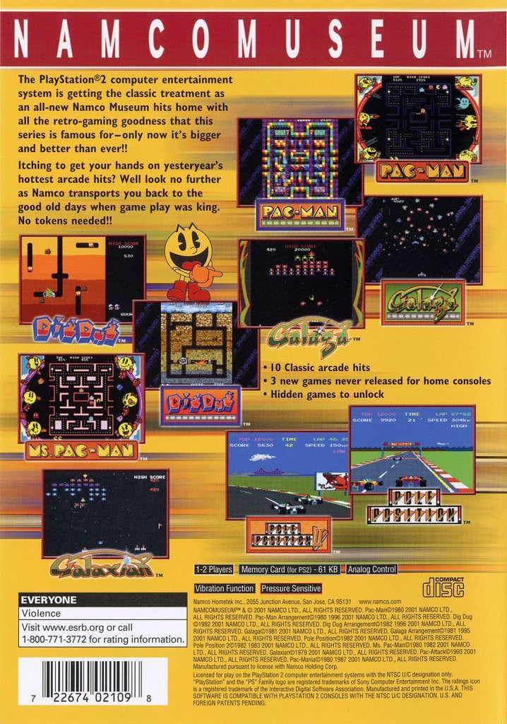 All your favorite Namco classics are now in one package. Namco Museum 1 includes Pac-Man, Ms. Pac-Man, Galaga, Galaxian, Dig Dug, and Pole Position. But the fun doesn't stop there, since Namco has added all new arrangement modes plus other hidden games. Whether it's eating ghosts, shooting aliens, digging a hole, or racing toward the finish line, the addictive gameplay of Namco Museum has proven it can stand the test of time.