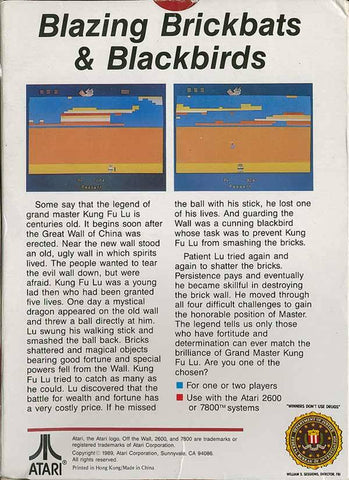 Some say that the legend of grand master Kung Fu Lu is centuries old. It begins soon after the Great Wall of China was erected. Near the new wall stood an old, ugly wall in which spirits lived. The people wanted to tear the evil wall down, but were afraid. Kung Fu Lu was a young lad then who had been granted five lives. One day a mystical dragon appeared on the old wall and threw a ball directly at him. Lu swung his walking stick and smashed the ball back. Bricks shattered and magical objects bearing good fortune and special powers fell from the Wall. Kung Fu Lu tried to catch as many as he could. Lu discovered that the battle for wealth and fortune has a very costly price. If he missed the ball with his stick, he lost one of his lives. And guarding the Wall was a cunning blackbird whose task was to prevent Kung Fu Lu from smashing the bricks. Patient Lu tried again and again to shatter the bricks. Persistence pays and eventually he became skillful in destroying the brick wall. He moved through all four difficult challenges to gain the honorable position of Master. The legend tells us only those who have fortitude and determination can ever match the brilliance of Grand Master Kung Fu Lu. Are you one of the chosen?