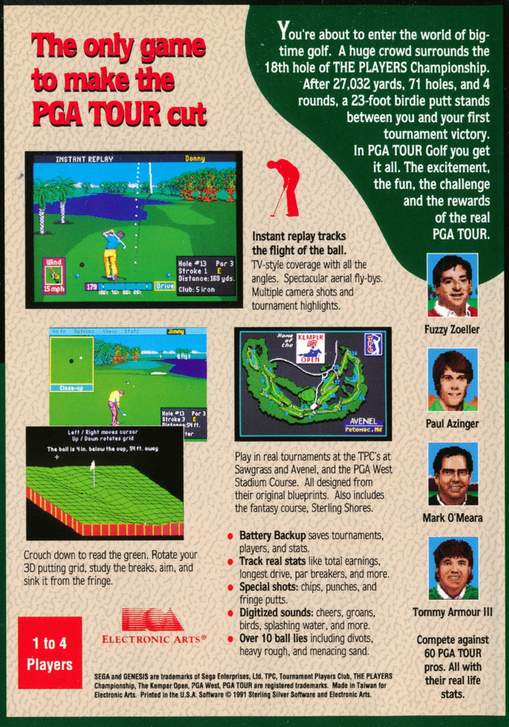 Play in real tournaments at the TPC's at Sawgrass and Avenel, and the PGA West Stadium Course. All designed from their original blueprints. Also includes the fantasy course, Sterling Shores.